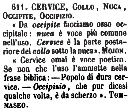 «Cervice omai è voce poetica. Se non che l'uso l'ammette nella frase biblica: - Popolo di dura cervice. - Occipizio, che pur dicesi qualche volta, è da scherzo». Tommaseo. [immagine] |