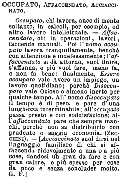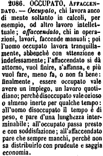 | Occupato, Affaccendato, Acciaccinato - Occupato, chi lavora, anco di mente soltanto, in calcoli, per esempio, od altro lavoro intellettuale. – Affaccendato, chi in operazioni, lavori, faccende manuali. Poi l’uomo occupato lavora tranquillamente, benché con attenzione e indefessamente; l’affaccendato si dà attorno, vuol finire, s’affanna, e più vuol fare, meno fa, o non fa bene: finalmente, Essere occupato vale Avere un impiego, un lavoro quotidiano; perché Disoccupato vale Ozioso o almeno inerte per qualche tempo. All’uomo disoccupato il tempo è di peso, e pare d’una lunghezza interminabile; all’occupato passa presto e con soddisfazione; all’affaccendato pare che sempre manchi, perché non sa distribuirlo con prudente e saggia economia. (Zecchini). – [Acciaccinato suol dirsi nel linguaggio familiare di chi si affaccenda ridevolmente a una o a più cose, dandosi un gran da fare e con gran calore, e più spesso per cose da poco e senza concluder molto. G.F.] [immagine] |