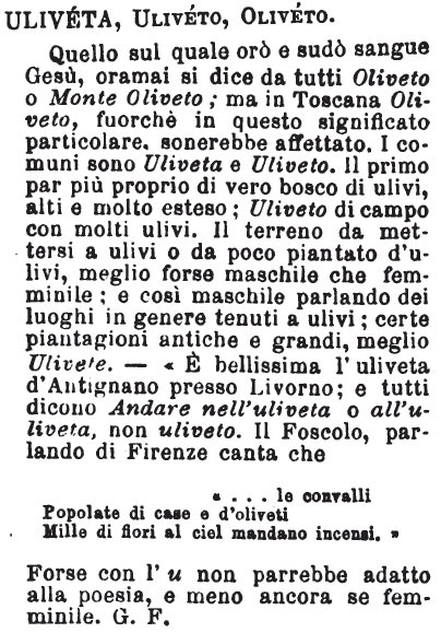 Uliveta, Uliveto, Oliveto - Quello sul quale orò e sudò sangue Gesù, oramai si dice da tutti Oliveto o Monte Oliveto; ma in Toscana Oliveto, fuorché in questo significato particolare, sonerebbe affettato. I comuni sono Uliveta e Uliveto. Il primo par più proprio di vero bosco di ulivi, alti e molto esteso; Uliveto di campo con molti ulivi. Il terreno da mettersi a ulivi o da poco piantato d'ulivi, meglio forse maschile che femminile; e così maschile parlando dei luoghi in genere tenuti a ulivi; certe piantagioni antiche e grandi, meglio Ulivete. - «E' bellissima l'uliveta d'Antignano presso Livorno; e tutti dicono Andare nell'uliveta o all'uliveta, non uliveto. Il Foscolo, parlando di Firenze canta che