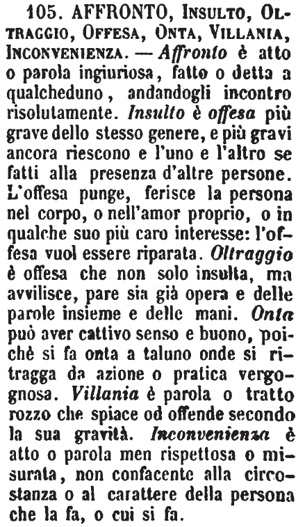 | Affronto, Insulto, Oltraggio, Offesa, Onta, Villania, Inconvenienza - Affronto è atto o parola ingiuriosa, fatto o detta a qualcheduno, andandogli incontro risolutamente. Insulto è offesa più grave dello stesso genere, e più gravi ancora riescono e l'uno e l'altro se fatti alla presenza d'altre persone. L'offesa punge, ferisce la persona nel corpo, o nell'amor proprio, o in qualche suo più caro interesse: l'offesa vuol essere riparata. Oltraggio è offesa che non solo insulta, ma avvilisce, pare sia già opera e delle parole insieme e delle mani. Onta può aver cattivo senso e buono, poiché si fa onta a taluno onde si ritragga da azione o pratica vergognosa. Villania è parola o tratto rozzo che spiace od offende secondo la sua gravità. Inconvenienza è atto o parola men rispettosa o misurata, non confacente alla circostanza o al carattere della persona che la fa, o cui si fa. [immagine] |