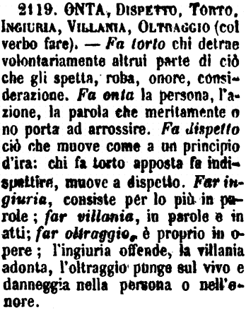 | Onta, Dispetto, Torto, Ingiuria, Villania, Oltraggio (col verbo fare) - Fa torto chi detrae volontariamente altrui parte di ciò che gli spetta, roba, onore, considerazione. Fa onta la persona, l'azione, la parola che meritamente o no porta ad arrossire. Fa dispetto ciò che muove come a un principio d'ira: chi fa torto apposta fa indispettire, muove a dispetto. Far ingiuria, consiste per lo più in parole; far villania, in parole e in atti; far oltraggio, è proprio in opere; l'ingiuria offende, la villania adonta, l'oltraggio punge sul vivo e danneggia nella persona o nell'onore. [immagine] |