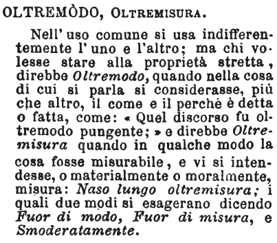 | Oltremodo, Oltremisura - Nell'uso comune si usa indifferentemente l'uno e l'altro; ma chi volesse stare alla proprietà stretta, direbbe Oltremodo, quando nella cosa di cui si parla si considerasse, più che altro, il come e il perchè è detta o fatta, come: «Quel discorso fu oltremodo pungente;» e direbbe Oltremisura quando in qualche modo la cosa fosse misurabile, e vi si intendesse, o materialmente o moralmente, misura: Naso lungo oltremisura; i quali due modi si esagerano dicendo Fuor di modo, Fuor di misura, e Smoderatamente. [immagine] |