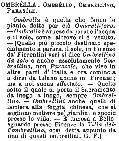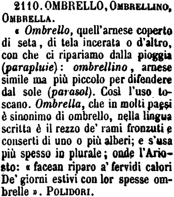 | Ombrello, Ombrellino, Ombrella - «Ombrello, quell'arnese coperto di seta, di tela incerata o d'altro, con che ci ripariamo dalla pioggia (parapluie): ombrellino, arnese simile ma più piccolo per difendere dal sole (parasol). Così l'uso toscano. Ombrella, che in molti paesi è sinonimo di ombrello, nella lingua scritta è il rezzo de' rami fronzuti e conserti di uno o più alberi; e s'usa più spesso in plurale; onde l'Ariosto: «facean riparo a' fervidi calori De' giorni estivi con lor spesse ombrelle». Polidori. [immagine] |