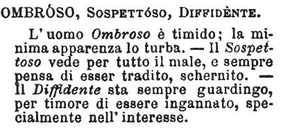 | Ombroso, Sospettoso, Diffidente - L'uomo Ombroso è timido; la minima apparenza lo turba. - Il Sospettoso vede per tutto il male, e sempre pensa di esser tradito, schernito. - Il Diffidente sta sempre guardingo, per timore di essere ingannato, specialmente nell'interesse. [immagine] |