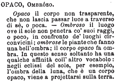 | Opaco, Ombroso - Opaco il corpo non trasparente che non lascia passar luce a traverso di sè, o poca: ombroso il luogo ove il sole non penetra co' suoi raggi, o poco, in confronto de' luoghi circonvicini: ombrose le piante che fanno una bell'ombra: il corpo opaco fa ombra: in questo senso soltanto ha una qualche affinità coll'altro vocabolo: negli eclissi del sole, per es., l'ombra della luna, che è un corpo opaco, viene a proiettarsi sulla terra. [immagine] |