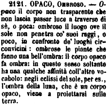 | Opaco, Ombroso - Opaco il corpo non trasparente, che non lascia passar luce a traverso di sè, o poca. - Ombroso il luogo ove il sole non penetra co' suoi raggi, o poco, in confronto de' luoghi circonvicini; ombrose le piante che fanno una bell'ombra; il corpo opaco fa ombra. In questo senso soltanto ha una qualche affinità coll'altro vocabolo: negli eclissi del sole, per esempio, l'ombra della luna, che è un corpo opaco, viene a projettarsi sulla terra. [immagine] |