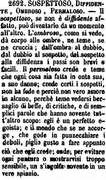 | Sospettoso, Diffidente, Ombroso, Permaloso - Il Sospettoso, se non è Diffidente affatto, può diventare da un momento all'altro. - L'Ombroso, come si vede, dà corpo alle ombre, ne teme, se ne cruccia; dall'ombra al dubbio, dal dubbio al sospetto, dal sospetto alla diffidenza, i passi sono brevi e facili. - Il Permaloso crede e teme che ogni cosa sia fatta in onta sua, a suo danno; crede certi i sospetti; non ha fede, e perciò non vero amore in alcuno, perché teme vedersi bersaglio di beffe, di critiche e di semplici parole che hanno sovente tutt'altro scopo. Egli è un perfetto egoista, e il mondo, che se ne accorge, che gode in punzecchiare i deboli, piglia gusto a fare appunto ciò che egli crede; onde, per evitare ogni puntura o mostrarvisi troppo sensibile, uno s'ingolfa sovente in un vero spinajo.