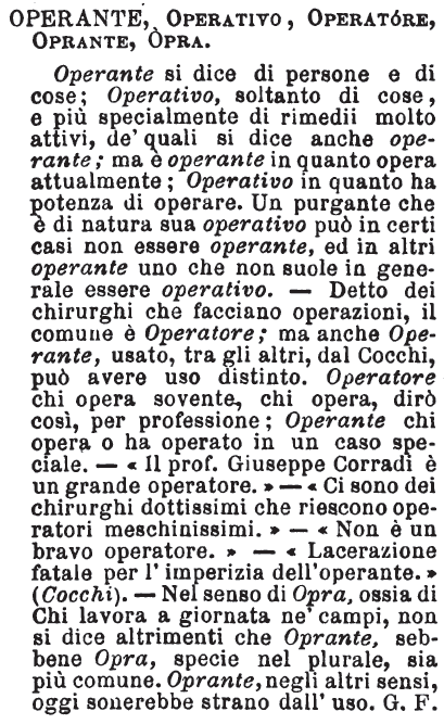 | Operante, Operativo, Operatore, Oprante, Opra - Operante si dice di persone e di cose; Operativo, soltanto di cose, e più specialmente di rimedii molto attivi, de' quali si dice anche operante; ma è operante in quanto opera attualmente; Operativo in quanto ha potenza di operare. Un purgante che è di natura sua operativo può in certi casi non essere operante, ed in altri operante uno che non suole in generale essere operativo. - Detto dei chirurghi che facciano operazioni, il comune è Operatore; ma anche Operante, usato, tra gli altri, dal Cocchi, può avere uso distinto. Operatore chi opera sovente, chi opera, dirò così, per professione; Operante chi opera o ha operato in un caso speciale. - «Il prof. Giuseppe Corradi è un grande operatore.» - «Ci sono dei chirurghi dottissimi che riescono operatori meschinissimi.» - «Non è un bravo operatore.» - «Lacerazione fatale per l'imperizia dell'operante.» (Cocchi). - Nel senso di Opra, ossia di Chi lavora a giornata ne' campi, non si dice altrimenti che Oprante, sebbene Opra, specie nel plurale, sia più comune. Oprante, negli altri sensi, oggi sonerebbe strano dall'uso. G. F. [immagine] |