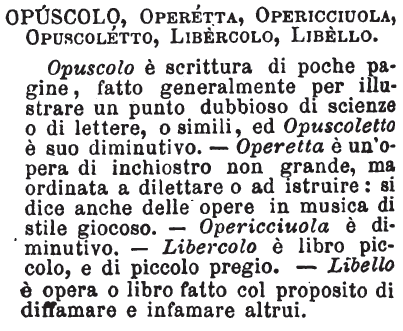 | Opuscolo, Operetta, Opericciuola, Opuscoletto, Libercolo, Libello - Opuscolo è scrittura di poche pagine, fatto generalmente per illustrare un punto dubbioso di scienze o di lettere, o simili, ed Opuscoletto è suo diminutivo. - Operetta è un'opera di inchiostro non grande, ma ordinata a dilettare o ad istruire: si dice anche delle opere in musica di stile giocoso. - Opericciuola è diminutivo. - Libercolo è libro piccolo, e di piccolo pregio. - Libello è opera o libro fatto col proposito di diffamare e infamare altrui. [immagine] |