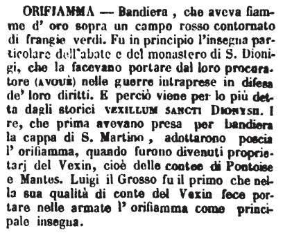 | Orifiamma - Bandiera, che aveva fiamme d'oro sopra un campo rosso contornato di frangie verdi. Fu in principio l'insegna particolare dell'abate e del monastero di S. Dionigi, che la facevano portare dal loro procuratore (avouè) nelle guerre intraprese in difesa de' loro diritti. E perciò viene per lo più detta dagli storici vexillum sancti Dionysii. I re, che prima avevano presa per bandiera la cappa di S. Martino, adottarono poscia l'orifiamma, quando furono divenuti proprietarj del Vexin, cioè delle contee di Pontoise e Mantes. Luigi il Grosso fu il primo che nella sua qualità di conte del Vexin fece portare nelle armate l'orifiamma come principale insegna. [immagine] |