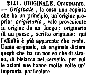 | Originale, Originario - Originale, la cosa non copiata che ha un principio, un'origine propria: originario, vale proveniente in origine da un luogo: originario di un paese, scritto originale: qui l'affinità è più apparente che reale. Uomo originale, un originale diciam quegli che ha un non so che di strano, di bislacco nel cervello, per cui le azioni sue hanno molte volte un'impronta particolare. [immagine] |