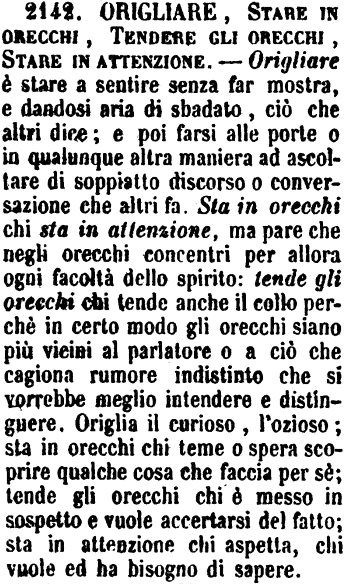 | Origliare, Stare in orecchi, Tendere gli orecchi, Stare in attenzione - Origliare è stare a sentire senza far mostra, e dandosi aria di sbadato, ciò che altri dice; e poi farsi alle porte o in qualunque altra maniera ad ascoltare di soppiatto discorso o conversazione che altri fa. Sta in orecchi chi sta in attenzione, ma pare che negli orecchi concentri per allora ogni facoltà dello spirito: tende gli orecchi chi tende anche il collo perchè in certo modo gli orecchi siano più vicini al parlatore o a ciò che cagiona rumore indistinto che si vorrebbe meglio intendere e distinguere. Origlia il curioso, l'ozioso; sta in orecchi chi teme o spera scoprire qualche cosa che faccia per sè; tende gli orecchi chi è messo in sospetto e vuole accertarsi del fatto; sta in attenzione chi aspetta, chi vuole ed ha bisogno di sapere. [immagine] |