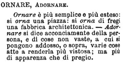 | Ornare, Adornare - Ornare è più semplice e più esteso: si orna una piazza: si orna di fregi una fabbrica architettonica. - Adornare si dice acconciamente della persona, e di cose non vaste, a cui si pongono addosso, o sopra, varie cose atte a renderla più vistosa; ma più di apparenza che di pregio. [immagine] |
