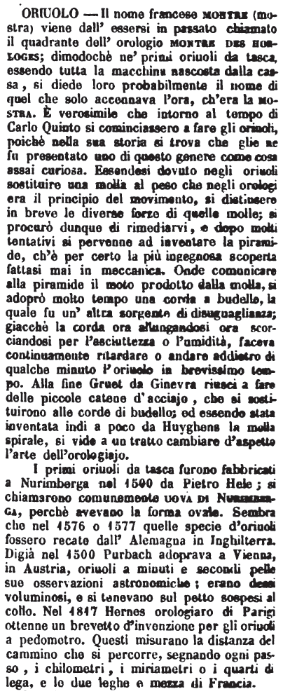 I primi oriuoli da tasca furono fabbricati a Nurimberga nel 1500 da Pietro Hele; si chiamarono comunemente uova di Nurimberga, perché avevano la forma ovale. Sembra che nel 1576 o 1577 quelle specie d'oriuoli fossero recate dall'Alemagna in Inghilterra. Digià nel 1500 Purbach adoprava a Vienna, in Austria, oriuoli a minuti e secondi pelle sue osservazioni astronomiche; erano dessi voluminosi e si tenevano sul petto sospesi al collo. Nel 1817 Hernes orologiaro di Parigi ottenne un brevetto d'invenzione per gli oriuoli a pedometro. Questi misurano la distanza del cammino che si percorre, segnando ogni passo, i chilometri, i miriametri o i quarti di lega, e le due leghe e mezza di Francia. [immagine] |