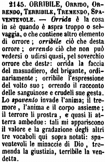 Orribile, Orrido, Orrendo, Terribile, Tremendo, Spaventevole - Orrida è la cosa in sè quando è aspra troppo o selvaggia, o che contiene altro elemento di orrore; orribile ciò che desta orrore; orrendo ciò che non può vedersi o udirsi quasi, pel soverchio orrore che desta: orrida la faccia del masnadiero, del brigante, ordinariamente; orribile l'espressione del volto suo; orrendo il racconto delle sanguinose e crudeli sue gesta. Lo spavento invade l'anima; il tremore, l'anima e il corpo assieme; il terrore li prostra, e quasi li atterra ambedue: tali mi appariscono il valore e la gradazione degli altri tre vocaboli qui sopra notati: spaventevoli le minaccie di Dio, tremenda la giustizia, terribile la vendetta. [immagine]