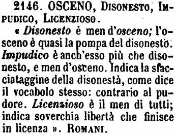| Osceno, Disonesto, Impudico, Licenzioso - « Disonesto è men d'osceno; l'osceno è quasi la pompa del disonesto. Impudico è anch'esso più che disonesto, e men d'osceno. Indica la sfacciataggine della disonestà, come dice il vocabolo stesso: contrario al pudore. Licenzioso è il men di tutti; indica soverchia libertà che finisce in licenza ». Romani. [immagine] |