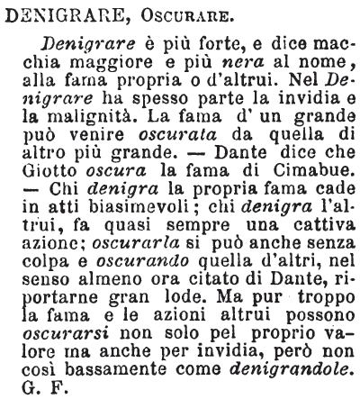 | Denigrare, Oscurare - Denigrare è più forte, e dice macchia maggiore e più nera al nome, alla farna propria o d'altrui. Nel Denigrare ha spesso parte la invidia e la malignità. La fama d'un grande può venire oscurata da quella di altro più grande. - Dante dice che Giotto oscura la fama di Cimabue. - Chi denigra la propria fama cade in atti biasimevoli; chi denigra l'altrui, fa quasi sempre una cattiva azione; oscurarla si può anche senza colpa e oscurando quella d'altri, nel senso almeno ora citato di Dante, riportarne gran lode. Ma pur troppo la fama e le azioni altrui possono oscurarsi non solo pel proprio valore ma anche per invidia, però non così bassamente come denigrandole. G. F. [immagine] |