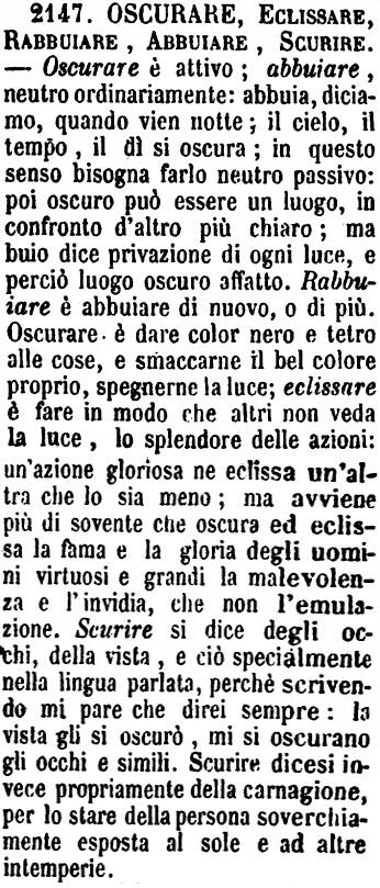 | Oscurare, Eclissare, Rabbuiare, Abbuiare, Scurire - Oscurare è attivo; abbuiare, neutro ordinariamente: abbuia, diciamo, quando vien notte; il cielo, il tempo, il dì si oscura; in questo senso bisogna farlo neutro passivo: poi oscuro può essere un luogo, in confronto d'altro più chiaro; ma buio dice privazione di ogni luce, e perciò luogo oscuro affatto. Rabbuiare è abbuiare di nuovo, o di più. Oscurare è dare color nero e tetro alle cose, e smaccarne il bel colore proprio, spegnerne la luce; eclissare è fare in modo che altri non veda la luce, lo splendore delle azioni: un'azione gloriosa ne eclissa un'altra che lo sia meno; ma avviene più di sovente che oscura ed eclissa la fama e la gloria degli uomini virtuosi e grandi la malevolenza e l'invidia, che non l'emulazione. Scurire si dice degli occhi, della vista, e ciò specialmente nella lingua parlata, perchè scrivendo mi pare che direi sempre: la vista gli si oscurò, mi si oscurano gli occhi e simili. Scurire dicesi invece propriamente della carnagione, per lo stare della persona soverchiamente esposta al sole e ad altre intemperie. [immagine] |
