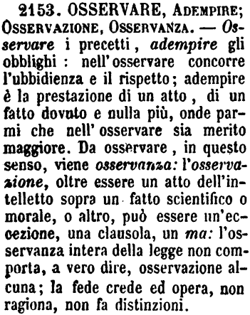 | Osservare, Adempire, Osservazione, Osservanza - Osservare i precetti, adempire gli obblighi: nell'osservare concorre l'ubbidienza e il rispetto; adempire è la prestazione di un atto, di un fatto dovuto e nulla più, onde parmi che nell'osservare sia merito maggiore. Da osservare, in questo senso, viene osservanza: l'osservazione, oltre essere un atto dell'intelletto sopra un fatto scientifico o morale, o altro, può essere un'eccezione, una clausola, un ma: l'osservanza intera della legge non comporta, a vero dire, osservazione alcuna; la fede crede ed opera, non ragiona, non fa distinzioni. [immagine] |