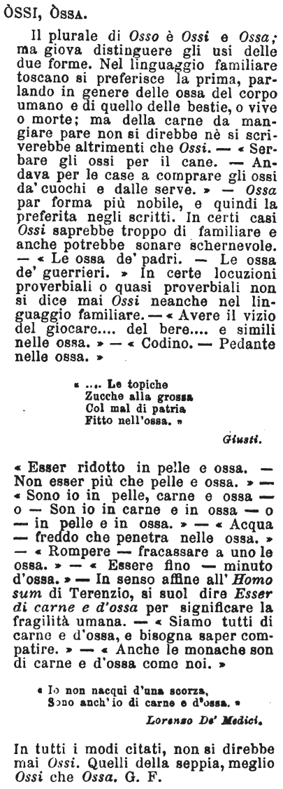 | Ossi, Ossa - Il plurale di Osso è Ossi e Ossa; ma giova distinguere gli usi delle due forme. Nel linguaggio familiare toscano si preferisce la prima, parlando in genere delle ossa del corpo umano e di quello delle bestie, o vive o morte; ma della carne da mangiare pare non si direbbe nè si scriverebbe altrimenti che Ossi. - « Serbare gli ossi per il cane. - Andava per le case a comprare gli ossi da' cuochi e dalle serve. » - Ossa par forma più nobile, e quindi la preferita negli scritti. In certi casi Ossi saprebbe troppo di familiare e anche potrebbe sonare schernevole. - « Le ossa de' padri. - Le ossa de' guerrieri. » In certe locuzioni proverbiali o quasi proverbiali non si dice mai Ossi neanche nel linguaggio familiare. - « Avere il vizio del giocare.... del bere.... e simili nelle ossa. » - « Codino. - Pedante nelle ossa. »