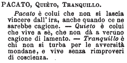 | Pacato, Quieto, Tranquillo - Pacato è colui che non si lascia vincere dall'ira, anche quando ce ne sarebbe cagione. - Quieto è colui che vive a sè, che non dà a veruno cagione di lamento. - Tranquillo è chi non si turba per le avversità mondane, e vive senza rimproveri di coscienza. [immagine] |