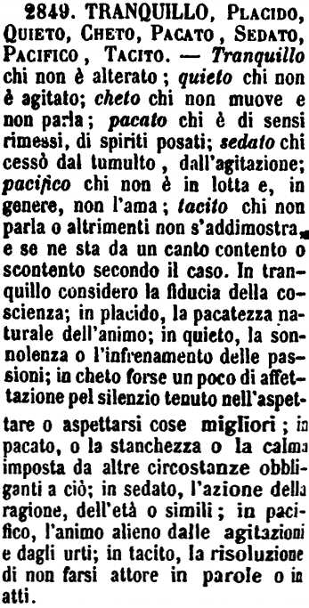 | Tranquillo, Placido, Quieto, Cheto, Pacato, Sedato, Pacifico, Tacito - Tranquillo chi non è alterato; quieto chi non è agitato; cheto chi non muove e non parla; pacato chi è di sensi rimessi, di spiriti posati; sedato chi cessò dal tumulto, dall'agitazione; pacifico chi non è in lotta e, in genere, non l'ama; tacito chi non parla o altrimenti non s'addimostra e se ne sta da un canto contento o scontento secondo il caso. In tranquillo considero la fiducia della coscienza; in placido, la pacatezza naturale dell'animo; in quieto, la sonnolenza o l'infrenamento delle passioni; in cheto forse un poco di affettazione pel silenzio tenuto nell'aspettare o aspettarsi cose migliori; in pacato, o la stanchezza o la calma imposta da altre circostanze obbliganti a ciò; in sedato, l'azione della ragione, dell'età o simili; in pacifico, l'animo alieno dalle agitazioni e dagli urti: in tacito, la risoluzione di non farsi attore in parole o in atti. [immagine] |