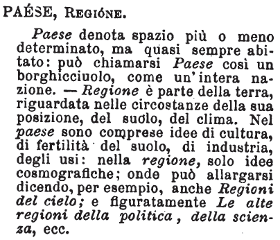 | Paese, Regione - Paese denota spazio più o meno determinato, ma quasi sempre abitato: può chiamarsi Paese così un borghicciuolo, come un'intera nazione. - Regione è parte della terra, riguardata nelle circostanze della sua posizione, del suolo, del clima. Nel paese sono comprese idee di cultura, di fertilità del suolo, di industria, degli usi: nella regione, solo idee cosmografiche; onde può allargarsi dicendo, per esempio, anche Regioni del cielo; e figuratamente Le alte regioni della, politica, della scienza, ecc. [immagine] |