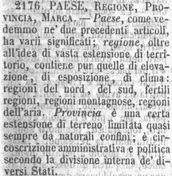 | Paese, Regione, Provincia, Marca - Paese, come vedemmo ne' due precedenti articoli, ha varii significati; regione, oltre all'idea di vasta estensione di territorio, contiene pur quelle di elevazione, di esposizione, di clima: regioni del nord, del sud, fertili regioni, regioni montagnose, regioni dell'aria. Provincia è una certa estensione di terreno limitata quasi sempre da naturali confini; è circoscrizione amministrativa e politica secondo la divisione interna de' diversi Stati. [immagine] |