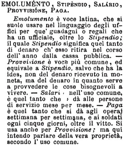 | Emolumento, Stipendio, Salario, Provvisione, Paga - Emolumento è voce latina, che si suole usare nel linguaggio degli uffici per que' guadagni o regali che ha un ufficiale, oltre lo Stipendio; il quale Stipendio significa quel tanto di denaro ch'esso ritira nel corso dell'anno dalla cassa pubblica. - Provvisione è voce più comune, ed equivale a Stipendio, salvo che ha la idea, non del denaro ricevuto in moneta, ma del denaro in quanto serve a provvedere le cose bisognevoli a vivere. - Salario nell'uso comune, è quel tanto che si dà alle persone di servizio mese per mese. - Paga è quel tanto che si dà agli operaj settimana per settimana, e ai soldati ogni cinque giorni, oltre il vitto. Si usa anche per Provvisione; ma qui intendo parlare della vera proprietà, secondo l'uso comune. [immagine] |