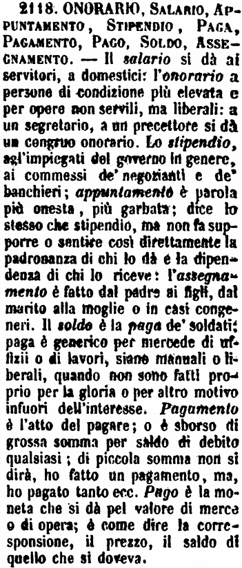 | Onorario, Salario, Appuntamento, Stipendio, Paga, Pagamento, Pago, Soldo, Assegnamento - Il salario si dà ai servitori, a domestici: l'onorario a persone di condizione più elevata e per opere non servili, ma liberali: a un segretario, a un precettore si dà un congruo onorario. Lo stipendio, agl'impiegati del governo in genere, ai commessi de' negozianti e de' banchieri; appuntamento è parola più onesta, più garbata; dice lo stesso che stipendio, ma non fa supporre o sentire così direttamente la padronanza di chi lo dà e la dipendenza di chi lo riceve: l'assegnamento è fatto dal padre ai figli, dal marito alla moglie o in casi congeneri. Il soldo è la paga de' soldati: paga è generico per mercede di uffizii o di lavori, siano manuali o liberali, quando non sono fatti proprio per la gloria o per altro motivo infuori dell'interesse. Pagamento è l'atto del pagare; o è sborso di grossa somma per saldo di debito qualsiasi; di piccola somma non si dirà, ho fatto un pagamento, ma, ho pagato tanto ecc. Pago è la moneta che si dà pel valore di merce o di opera; è come dire la corresponsione, il prezzo, il saldo di quello che si doveva. [immagine] |