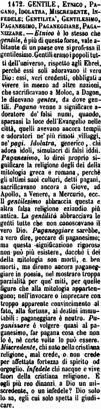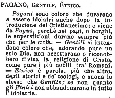 | Pagano, Gentile, Etnico - Pagani sono coloro che durarono a essere idolatri anche dopo la introduzione del Cristianesimo; e viene da Pagus, perchè nei pagi, o borghi, le superstizioni durano sempre più che per le città. - Gentili si intendono coloro che, adorando pure un solo Dio, non accettarono o riconobbero divina la religione di Cristo, come pure i più nobili tra' Romani. - Etnico è parola, più che altro, degli storici e de' teologi, e suona lo stesso che Gentile; se non quanto gli Etnici non abbandonarono in tutto l'idolatria. [immagine] |