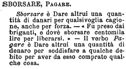 | Sborsare, Pagare - Sborsare è Dare altrui una quantità di danari per qualsivoglia cagione, anche per forza. - «Fu preso dai briganti, e dovè sborsare centomila lire per liberarsi.» - Il verbo Pagare è Dare altrui una quantità di denaro per soddisfare a qualche debito per aver da esso comprato qualche cosa. [immagine] |