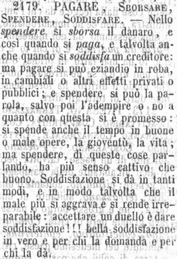 | Pagare, Sborsare, Spendere, Soddisfare - Nello spendere si sborsa il danaro, e così quando si paga, e talvolta anche quando si soddisfa un creditore: ma pagare si può eziandio in roba, in cambiali o altri effetti privati o pubblici; e spendere si può la parola, salvo poi l'adempire o no a quanto con questa si è promesso: si spende anche il tempo in buone o male opere, la gioventù, la vita; ma spendere, di queste cose parlando, ha più senso cattivo che buono. Soddisfazione si dà in tanti modi, e in modo talvolta che il male più si aggrava e si rende irreparabile: accettare un duello è dare soddisfazione!!! bella soddisfazione in vero e per chi la domanda e per chi la dà. [immagine] |