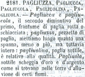 | Pagliuzza, Pagliucca, Pagliucola, Pagliuolina, Pagliuola - Pagliucca e pagliucola, il secondo diminutivo del primo, frantume di paglia rotta o schiacciata; pagliuzza, pezzetto di paglia, mettiamo lungo quanto una spanna, meno o più, ma tuttavia intero: pagliuolina, paglia sottile, è relativo alla qualità. Pagliuola, sottile scheggia d'oro e d'argento come si trovano nelle terre d'alluvione di certi fiumi. [immagine] |