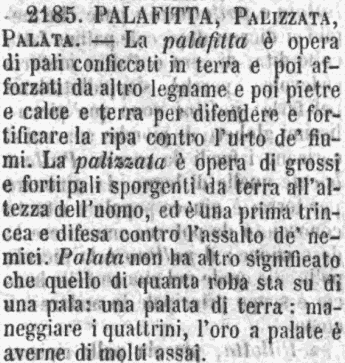 | Palafitta, Palizzata, Palata - La palafitta è opera di pali conficcati in terra e poi afforzati da altro legname e poi pietre e calce e terra per difendere e fortificare la ripa contro l'urto de' fiumi. La palizzata è opera di grossi e forti pali sporgenti da terra all'altezza dell'uomo, ed è una prima trincea e difesa contro l'assalto de' nemici. Palata non ha altro significato che quello di quanta roba sta su di una pala: una palata di terra: maneggiare i quattrini, l'oro a palate è averne di molti assai. [immagine] |