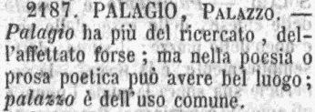 | Palagio, Palazzo - Palagio ha più del ricercato, dell'affettato forse; ma nella poesia o prosa poetica può avere bel luogo; palazzo è dell'uso comune. [immagine] |
