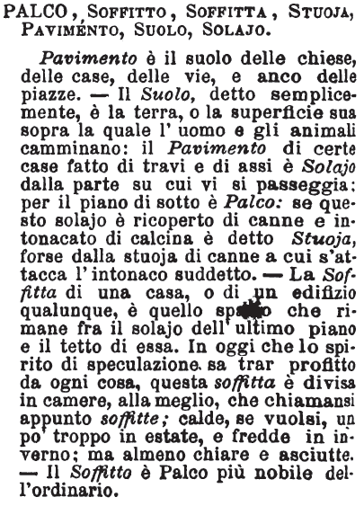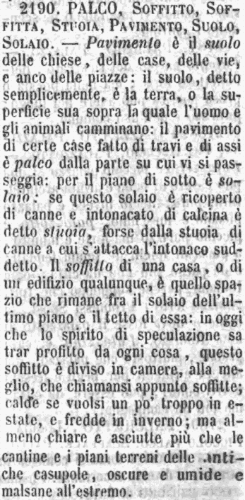 | Palco, Soffitto, Soffitta, Stuoia, Pavimento, Suolo, Solaio - Pavimento è il suolo delle chiese, delle case, delle vie, e anco delle piazze: il suolo, detto semplicemente, è la terra, o la superficie sua sopra la quale l'uomo e gli animali camminano: il pavimento di certe case fatto di travi e di assi è palco dalla parte su cui vi si passeggia: per il piano di sotto è solaio: se questo solaio è ricoperto di canne e intonacato di calcina è detto stuoia, forse dalla stuoia di canne a cui s'attacca l'intonaco suddetto. Il soffitto di una casa, o di un edifizio qualunque, è quello spazio che rimane fra il solaio dell'ultimo piano e il tetto di essa: in oggi che lo spirito di speculazione sa trar profitto da ogni cosa, questo soffitto è diviso in camere, alla meglio, che chiamansi appunto soffitte; calde se vuolsi un po' troppo in estate, e fredde in inverno; ma almeno chiare e asciutte più che le cantine e i piani terreni delle antiche casupole, oscure e umide e malsane all'estremo. [immagine] |