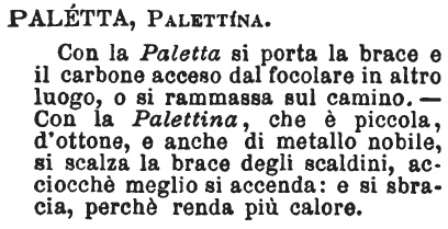 | Paletta, Palettina - Con la Paletta si porta la brace e il carbone acceso dal focolare in altro luogo, o si rammassa sul camino. - Con la Palettina, che è piccola, d'ottone, e anche di metallo nobile, si scalza la brace degli scaldini, acciocchè meglio si accenda: e si sbracia, perchè renda più calore. [immagine] |