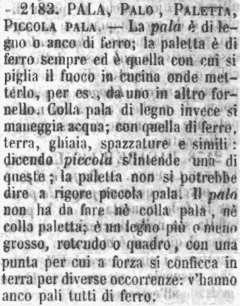 | Pala, Palo, Paletta, Piccola pala - La pala è di legno o anco di ferro; la paletta è di ferro sempre ed è quella con cui si piglia il fuoco in cucina onde metterlo, per es., da uno in altro fornello. Colla pala di legno invece si maneggia acqua; con quella di ferro, terra, ghiaia, spazzature e simili: dicendo piccola s'intende una di queste; la paletta non si potrebbe dire a rigore piccola pala. Il palo non ha da fare nè colla pala nè colla paletta; è un legno più o meno grosso, rotondo o quadro, con una punta per cui a forza si conficca in terra per diverse occorrenze: v'hanno anco pali tutti di ferro. [immagine] |