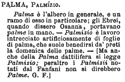 | Palma, Palmizio - Palma è l'albero in generale, e un ramo di esso in particolare; gli Ebrei, quando dissero Osanna, portavano palme in mano. - Palmizio è lavoro intrecciato artificiosamente di foglie di palma, che suole benedirsi da' preti la domenica delle palme. - [Ma anche della Palma dattilifera si legge Palmizio; peraltro i Palmizii notati dal Fanfani non si direbbero Palme. G. F.] [immagine] |