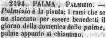 | Palma, Palmizio - Palmizio è la pianta; i rami che se ne staccano per essere benedetti il giorno della domenica delle palme, palme appunto si chiamano. [immagine] |