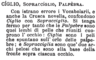 | Ciglio, Sopracciglio, Palpebra - Con istrano errore i Vocabolarii, e anche la Crusca novella, confondono Ciglio con Sopracciglio. Si tenga fermo per tanto che le Palpebre sono quei lembi di pelle che riuniti cuoprono l'occhio: Ciglia sono i peli che spuntano sull'orlo delle palpebre; e Sopracciglia sono que' due archi pelosi che sono alla base della fronte sopra ciascun occhio. [immagine] |