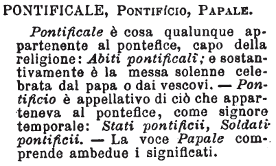 | Papale, Papalino, Papesco, Pontificio, Pontificale - Il papa è il sommo pontefice; quindi pontefici minori o a lui inferiori gerarchicamente sono i vescovi per es., e altri grandi dignitarii della Chiesa: dunque l'aggettivo pontificale non è soltanto relativo al papa o a cose a lui spettanti. Così dovrebbe pur essere per ragione di analogia dell'altro aggettivo pontificio; ma pure non è, non si dice che degli Stati romani che del papa sono, o almeno della S. Sede; e delle bolle dal papa emanate; abiti pontificali anche quelli dei vescovi quando hanno da celebrare qualche parte de' divini uffizii; che anzi le insegne speciali del papa, saranno dette papali: poi, benedizione papale, la quale è data anco da altri ministri dell'altare, ma per ispeciale missione o permesso del papa. Papalino si dice e de' sudditi, e de' soldati del papa, e delle doppie fatte coniare dai papi: non ha suono molto nobile, ma papesco lo ha meno ancora; e forse per ciò è poco o nulla usato. [immagine] |
