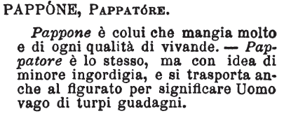 | Pappone, Pappatore - Pappone è colui che mangia molto e di ogni qualità di vivande. - Pappatore è lo stesso, ma con idea di minore ingordigia, e si trasporta anche al figurato per significare Uomo vago di turpi guadagni. [immagine] |