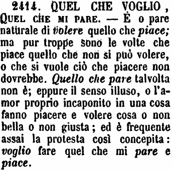 | Quel che voglio, Quel che mi pare - È o pare naturale di volere quello che piace; ma pur troppo sono le volte che piace quello che non si può volere, o che si vuole ciò che piacere non dovrebbe. Quello che pare talvolta non è; eppure il senso illuso, o l'amor proprio incaponito in una cosa fanno piacere e volere cosa o non bella o non giusta; ed è frequente assai la protesta così concepita: voglio fare quel che mi pare e piace. [immagine] |