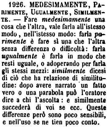 | Medesimamente, Parimente, Ugualmente, Similmente - Fare medesimamente una cosa che l'altra, vale farla all'istesso modo, nell'istesso modo: farla parimente è fare sì una che l'altra senza differenza o difficoltà: farla ugualmente è farla in modo che resti uguale, o adoperando per farla gli stessi mezzi: similmente dicesi di ciò che ha relazione di similitudine: dopo avere narrato un fatto vero o una parabola può l'oratore dire a chi l'ascolta: e similmente succederà di voi se ecc. Queste differenze però sono poco sensibili, e nell'uso se ne tien poco conto. [immagine] |