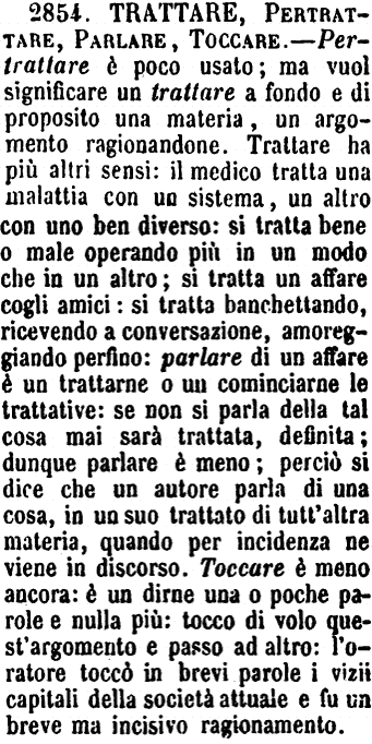 | Trattare, Pertrattare, Parlare, Toccare - Pertrattare è poco usato; ma vuol significare un trattare a fondo e di proposito una materia, un argomento ragionandone. Trattare ha più altri sensi: il medico tratta una malattia con un sistema, un altro con uno ben diverso: si tratta bene o male operando più in un modo che in un altro; si tratta un affare cogli amici: si tratta banchettando, ricevendo a conversazione, amoreggiando perfino: parlare di un affare è un trattarne o un cominciarne le trattative: se non si parla della tal cosa mai sarà trattata, definita; dunque parlare è meno; perciò si dice che un autore parla di una cosa, in un suo trattato di tutt'altra materia, quando per incidenza ne viene in discorso. Toccare è meno ancora: è un dirne una o poche parole e nulla più: tocco di volo quest'argomento e passo ad altro: l'oratore toccò in brevi parole i vizii capitali della società attuale e fu un breve ma incisivo ragionamento. [immagine] |