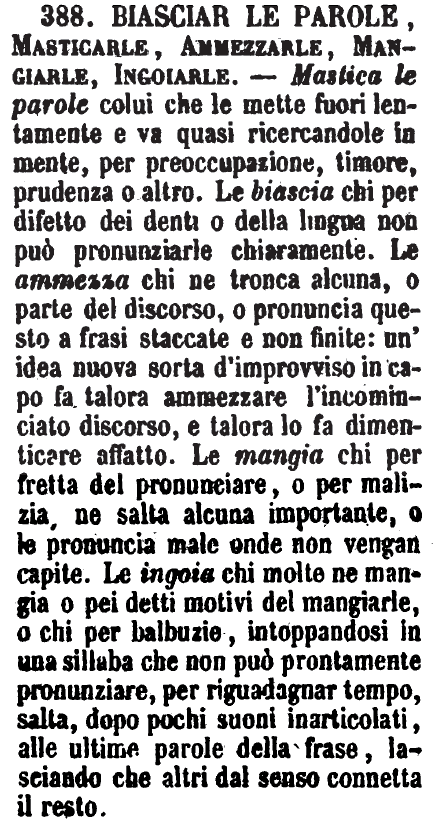 | Biasciar le parole, Masticarle, Ammezzarle, Mangiarle, Ingoiarle - Mastica le parole colui che le mette fuori lentamente e va quasi ricercandole in mente, per preoccupazione, timore, prudenza o altro. Le biascia chi per difetto dei denti o della lingua non può pronunziarle chiaramente. Le ammezza chi ne tronca alcuna, o parte del discorso, o pronuncia questo a frasi staccate e non finite: un'idea nuova sorta d'improvviso in capo fa talora ammezzare l'incominciato discorso, e talora lo fa dimenticare affatto. Le mangia chi per fretta del pronunciare, o per malizia, ne salta alcuna importante, o le pronuncia male onde non vengan capite. Le ingoia chi molte ne mangia o pei detti motivi del mangiarle, o chi per balbuzie, intoppandosi in una sillaba che non può prontamente pronunziare, per riguadagnar tempo, salta, dopo pochi suoni inarticolati, alle ultime parole della frase, lasciando che altri dal senso connetta il resto. [immagine] |