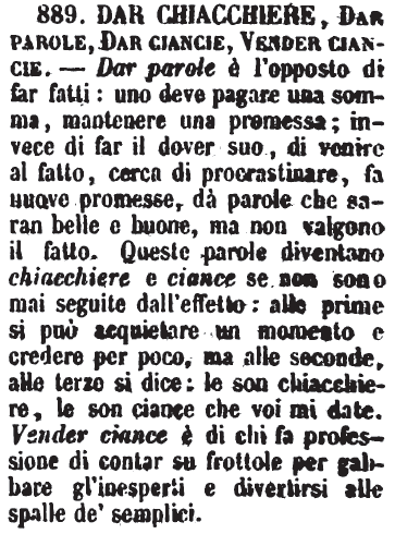 | Dar chiacchiere, Dar parole, Dar ciancie, Vender ciancie - Dar parole è l'opposto di far fatti: uno deve pagare una somma, mantenere una promessa; invece di far il dover suo, di venire al fatto, cerca di procrastinare, fa nuove promesse, dà parole che saran belle e buone, ma non valgono il fatto. Queste parole diventano chiacchiere e ciance se non sono mai seguite dall'effetto: alle prime si può acquietare un momento e credere per poco, ma alle seconde, alle terze si dice: le son chiacchiere, le son ciance che voi mi date. Vender ciance è di chi fa professione di contar su frottole per gabbare gl'inesperti e divertirsi alle spalle de' semplici. [immagine] |