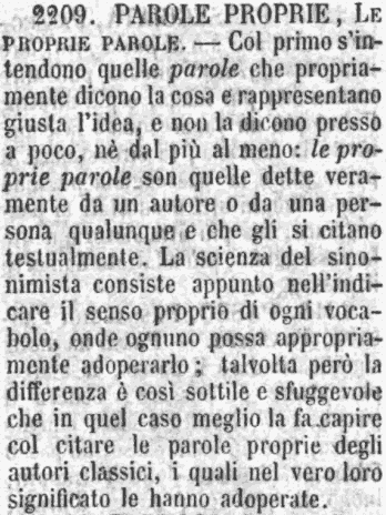 | Parole proprie, Le proprie parole - Col primo s'intendono quelle parole che propriamente dicono la cosa e rappresentano giusta l'idea, e non la dicono presso a poco, nè dal più al meno: le proprie parole son quelle dette veramente da un autore o da una persona qualunque e che gli si citano testualmente. La scienza del sinonimista consiste appunto nell'indicare il senso proprio di ogni vocabolo, onde ognuno possa appropriamente adoperarlo; talvolta però la differenza è così sottile e sfuggevole che in quel caso meglio la fa capire col citare le parole proprie degli autori classici, i quali nel vero loro significato le hanno adoperate. [immagine] |
